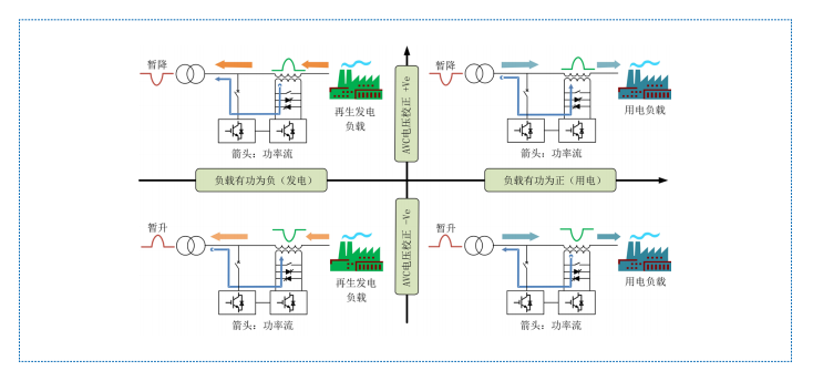 當(dāng)負(fù)載為發(fā)電狀態(tài)(有功功率為負(fù))時,電源側(cè)電壓發(fā)生暫升,整流器從電網(wǎng)側(cè)獲取能量,逆變器 又把獲取的能量通過變壓器注入到主回路中,以補償電壓的暫升。