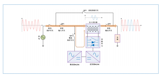 HTAVC 時刻監(jiān)測輸入側(cè)電源電壓,一旦發(fā)生電壓暫降或暫升,控制單元控制逆變器向串聯(lián)的注入變壓器注入適當(dāng)?shù)难a償電壓,快速將負(fù)載端電壓調(diào)節(jié)到額定值,從而減少來自電網(wǎng)輸入端的電壓暫降、暫升等對負(fù)載的影響。
