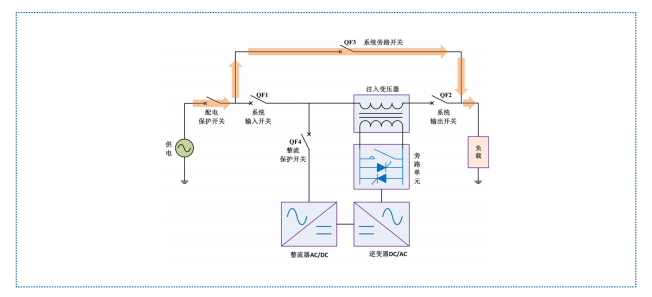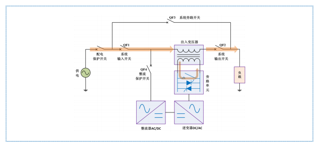 HTAVC 在自身設(shè)備發(fā)生故障時會自動轉(zhuǎn)為內(nèi)部旁路供電,旁路快速響應(yīng)由晶閘管切換完成,旁 路保持由機械觸點完成。此時,逆變器不生成補償電壓,市電通過注入變壓器主回路側(cè)繞組直接為負(fù)載供電。